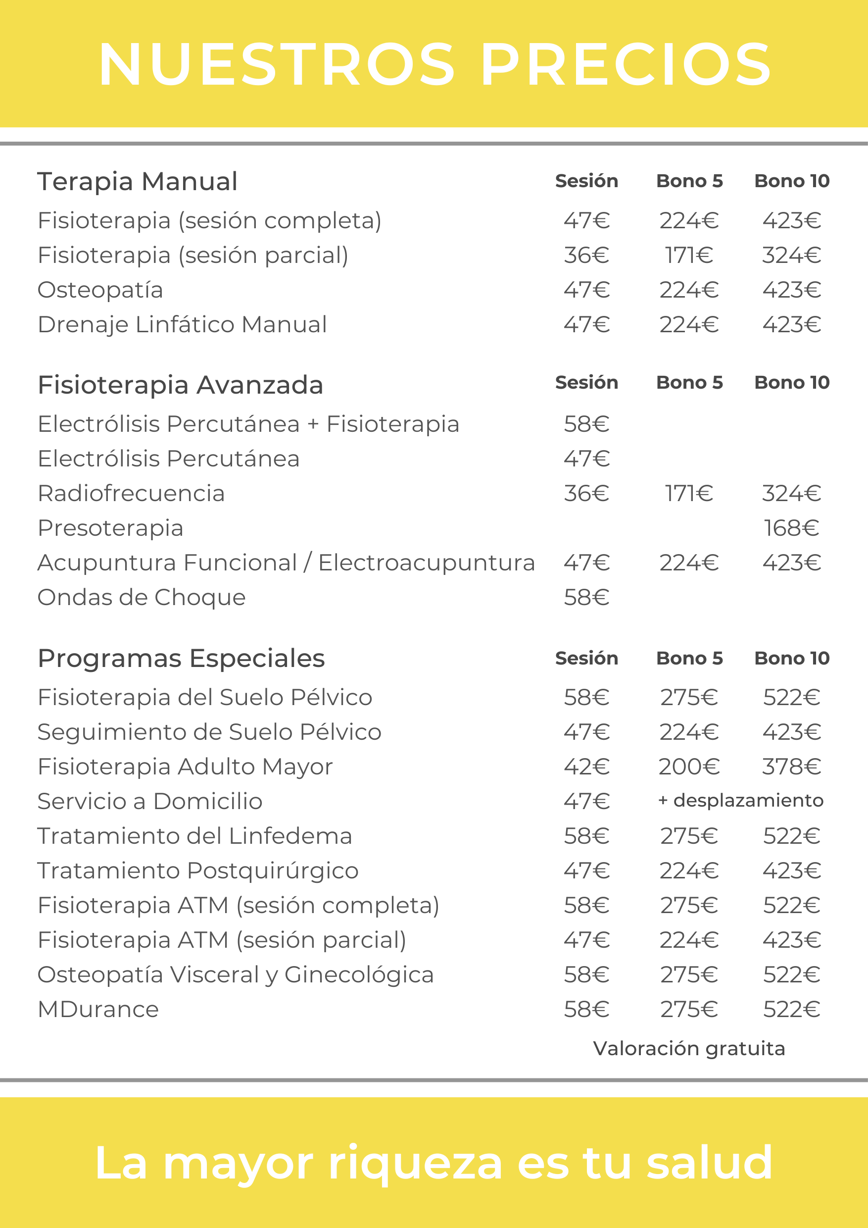 En la primera sesión, realizaremos la valoración e iniciaremos el tratamiento, que combinará técnicas de terapia manual, fisioterapia avanzada y ejercicio. También podemos realizar una sesión previa de valoración en la cual te daremos una pauta de tratamiento adecuada a tu dolencia, que podrás comenzar cogiendo una nueva cita.